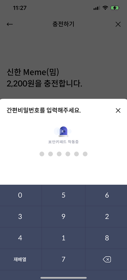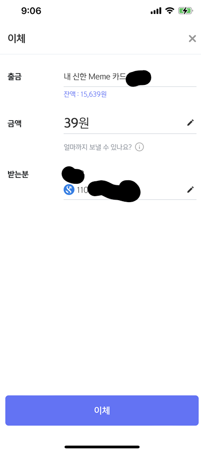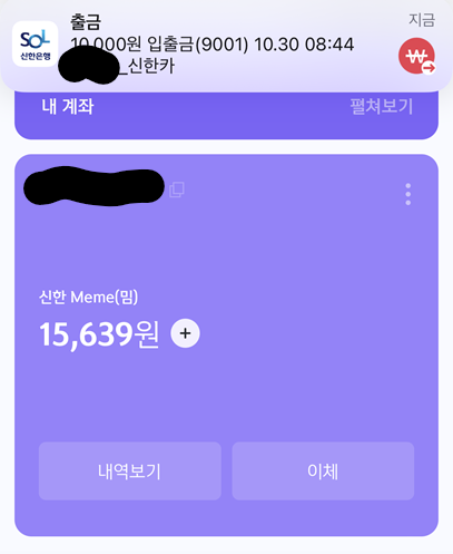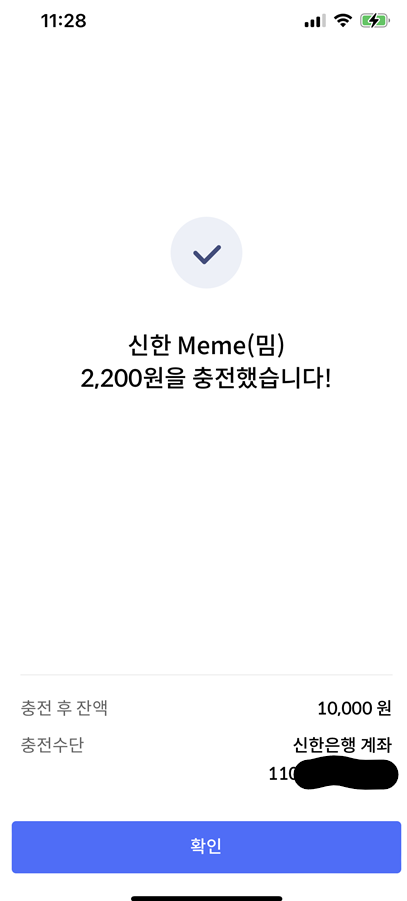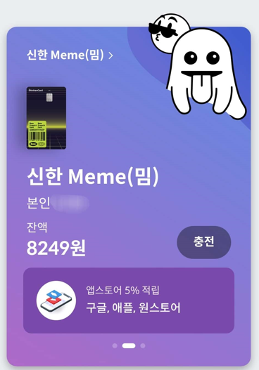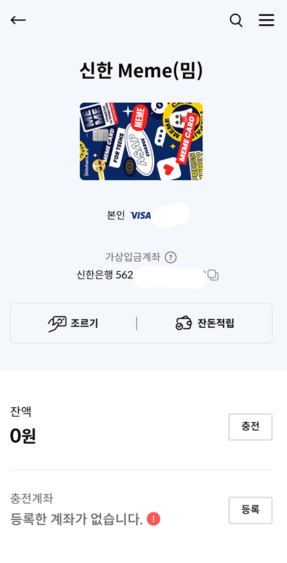 플러스 버튼을 눌러 충전시 예금주가 (이름)_신한카드 라고 나올때 눈치 챘는데 무통장 방식으로 충전된다. 플러스 버튼을 누르면 밈 카드 가상계좌로 돈이 이체되는 방식.