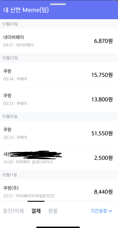 신한 SOL에서 위와 같이 신한 밈의 잔액과 사용 내역을 확인 가능하다.