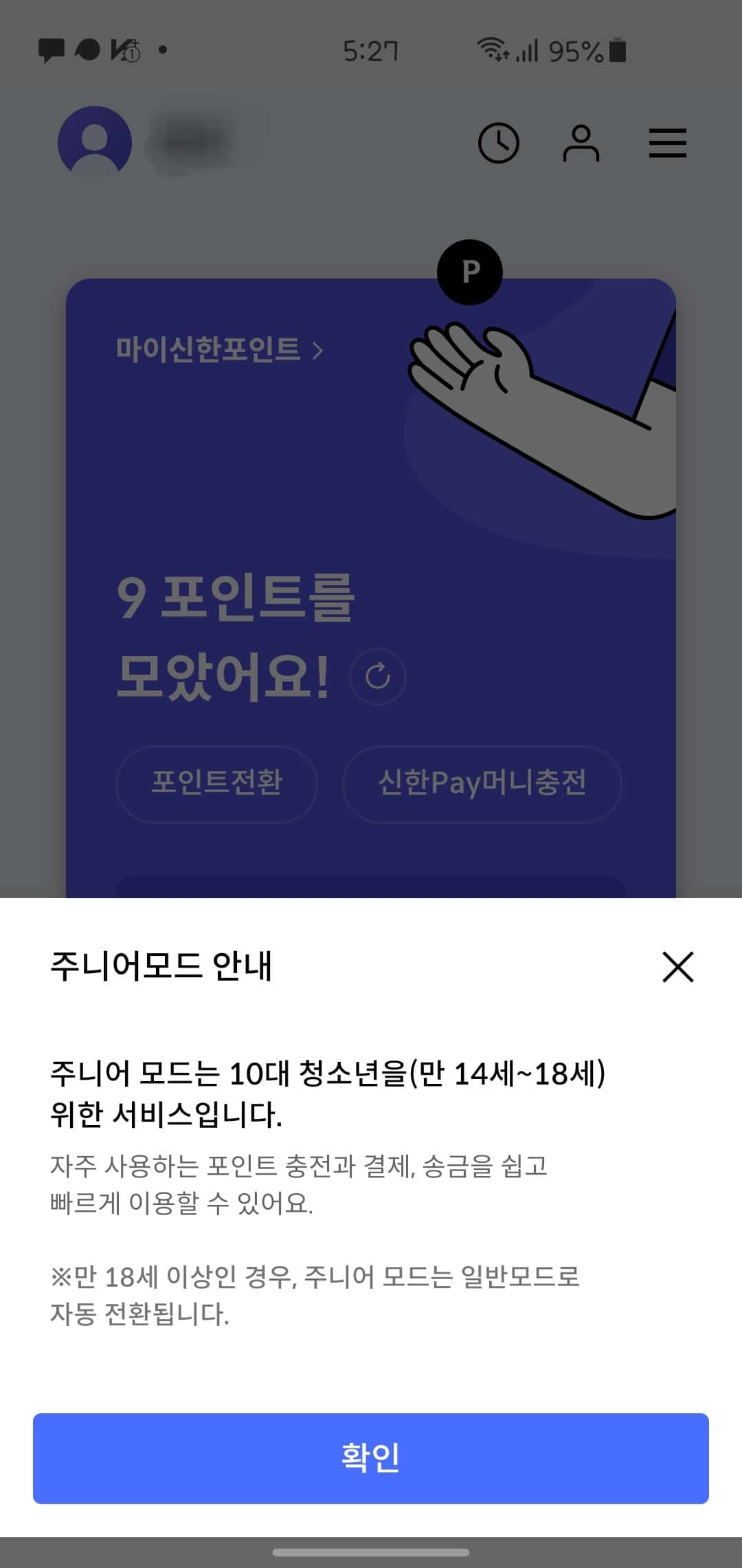 신한페이판 앱의 주니어 모드