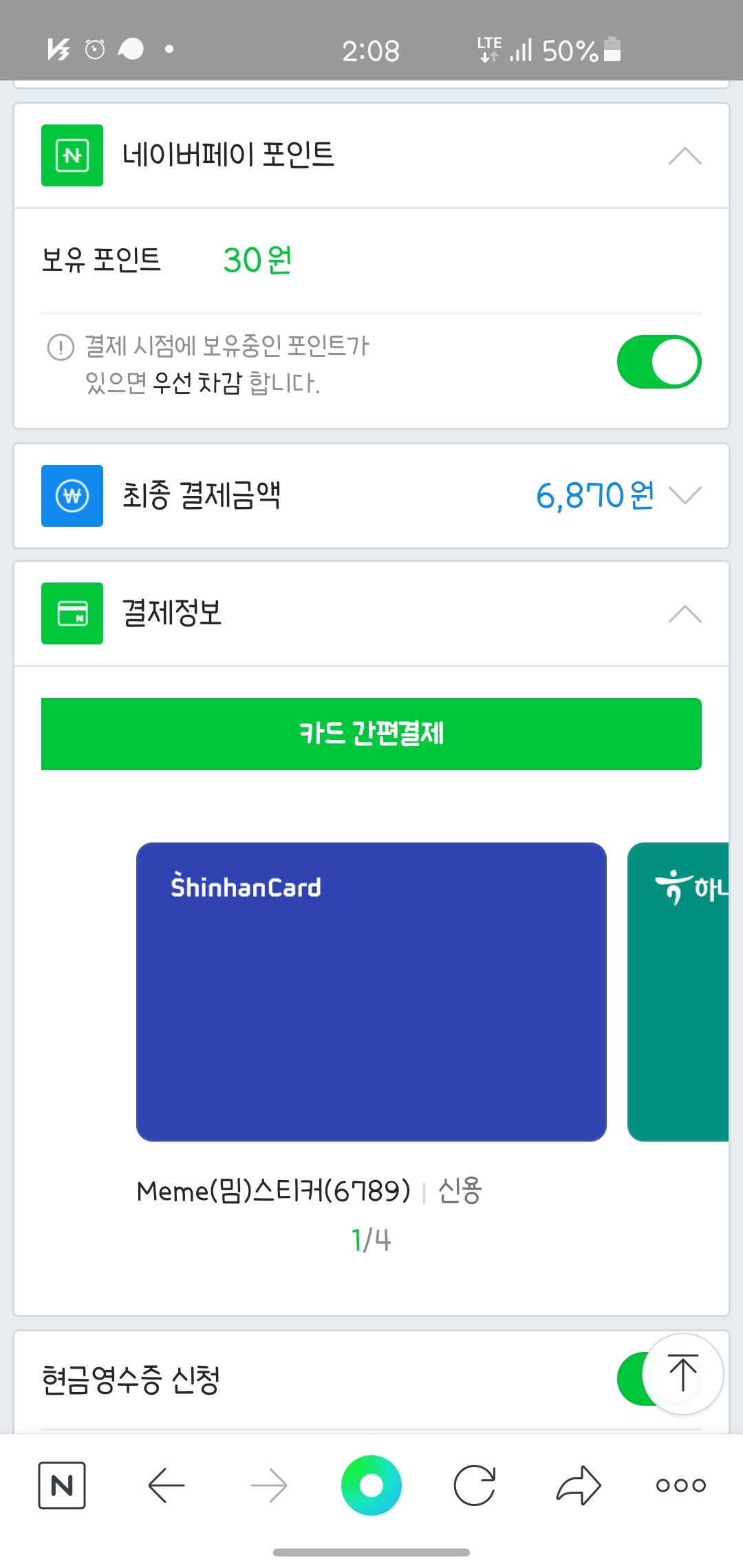 나마네 카드나 코나 카드 등 온라인 결제가 불가능"했었던" 카드들을 보았어서 그런지 혹시 온라인 결제가 되지 않을까 걱정했는데 쿠팡에서 결제가 잘 된다.