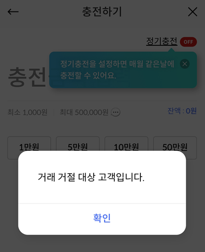 거래 거절 대상 고객이라며 충전이 거절된다. 가상 계좌를 통해서만 충전이 가능한데, 앞에서 서술했듯이 가상 계좌를 통해서는 충전 횟수 제한이 존재하기에 이는 그냥 넘길 수 있는 버그가 아닌 거 같다.