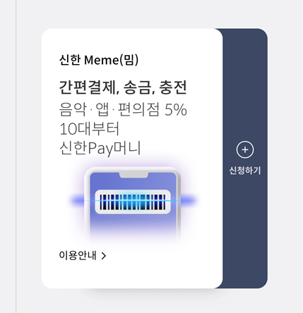 신한 플레이(구 신한페이판)의 카드를 스크롤하다 보면 신한 Meme(밈)이라는 카드를 볼 수 있다. 신청하기를 누르면 앞에서 본 신청 화면이 나오게 된다.