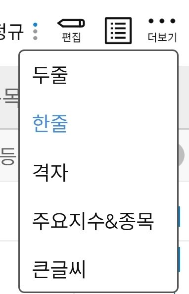 관심종목 탭에서도 오른쪽 위, 펴집 버튼 오른쪽에 있는걸 탭하면 두줄, 한줄, 격자, 주요지수, 큰글씨중에서 선택할 수 있다. 기본은 두줄인데 글쓰는사람은 삼성증권처럼 한 줄로 바꿔놨다.