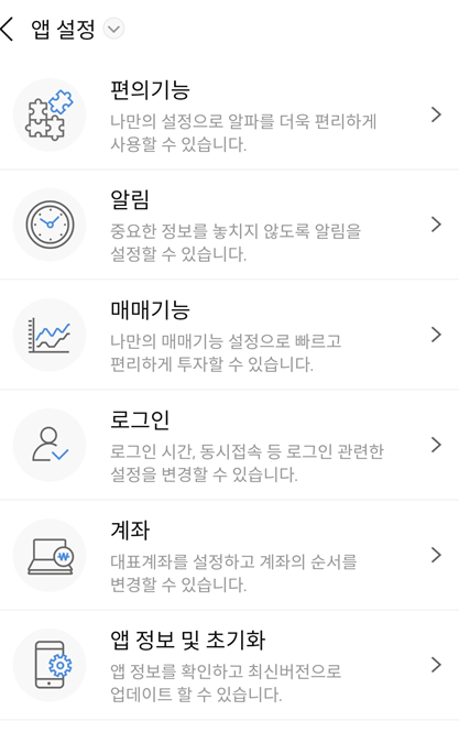 커스터마이징이라고 할것도 없지만, 글쓰는사람은 기존에 삼성증권을 사용했기에 삼성증권과 비슷한 환경이 편했다. 메뉴 -> 설정에 들어가면,