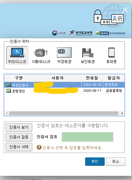 학생 인증서가 아닌 은행 공인인증서(범용 공인인증서도 괜찮다)로 로그인을 한다.