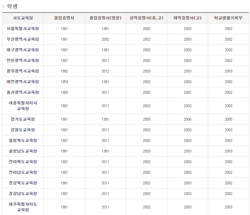 학교 생활기록부 클릭. 그리고 중요한게 있는데 각 교육청마다 발급이 가능한 생활기록부 년도가 다르다. 서울특별시교육청같은 경우에는 2002년부터 발급이 가능하다. 다른 교육청은 아래 표 참고.