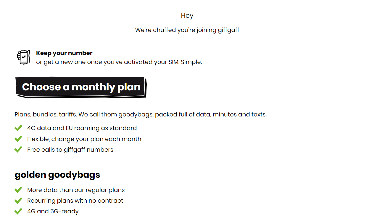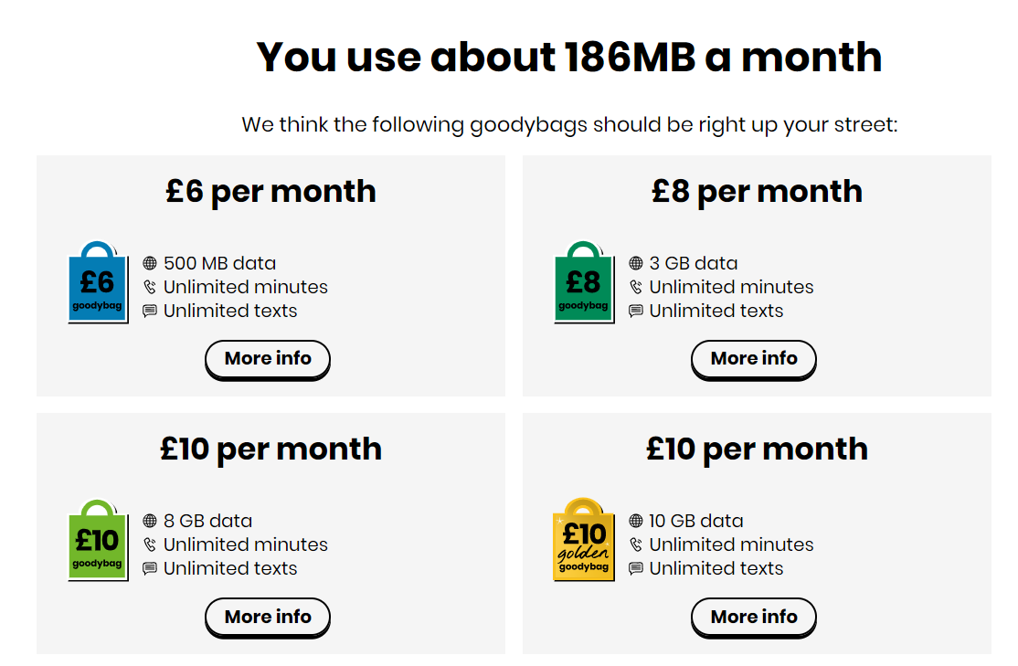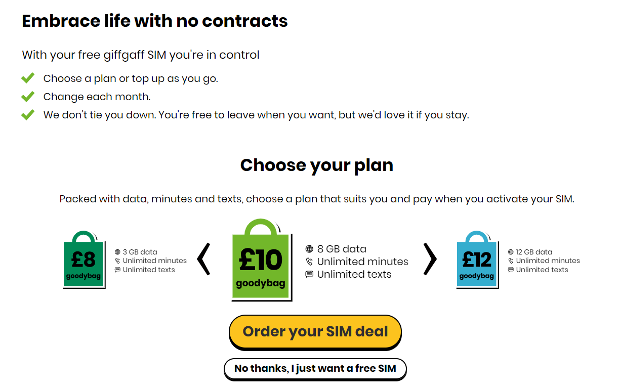 이제 요금제를 선택하여야한다. https://www.giffgaff.com/how-much-data-do-i-need 왼쪽으로 이동해 자신에게 잘 맞는 요금제를 추천받은 후, 선택하면 된다.